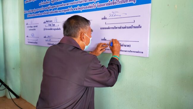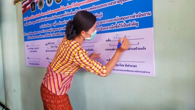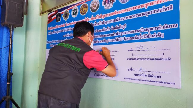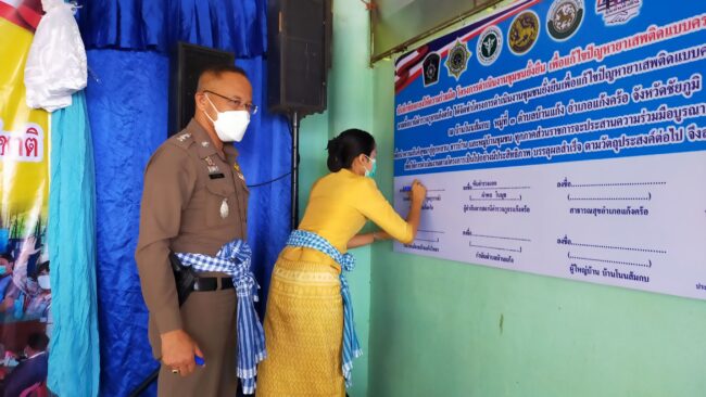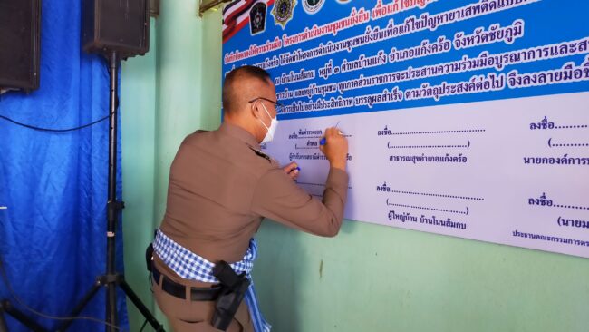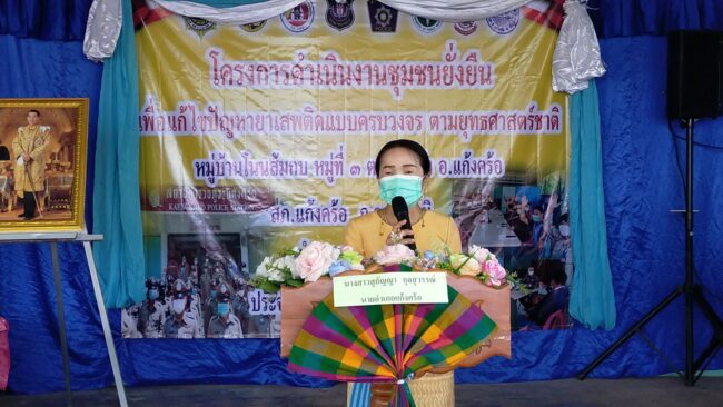 สภ.แก้งคร้อ ได้จัดพิธีเปิดโครงการชุมชนยั่งยืน เพื่อแก้ไขปัญหายาเสพติด แบบครบวงจร ตามยุทธศาสตร์ชาติ ประจำปี 2565 มี นางสาวสุกัญญา กุลสุวรรณ์ นายอำเภอแก้งคร้อ เป็นประธานในพิธีเปิด ณ ศาลาประชาคม บ้านโนนส้มกบ ม.3 ต.บ้านแก้ง อ.แก้งคร้อ จ.ชัยภูมิ โดย พ.ต.อ.คำพล โนนุช ผกก.สภ.แก้งคร้อ พร้อมด้วย พ.ต.ท.พัฐพน ศิริวัฒน์ รอง ผกก.ป.ฯ,พ.ต.ต.ณัฐพงศ์ สมสุข สวป.ฯ ชุดปฏิบัติการ หัวหน้าส่วราชการในพื้นที่ สาธารณสุขอำเภอแก้งคร้อ,เกษตรอำเอแก้งคร้อ นายก อบต.บ้านแก้ง, ,ผอ.ร.ร.มัธยมบ้านแก้งวิทยา,ผอ.รพ.สต.บ้านแก้ง ,คณะ กต.ตร.สภ.แก้งคร้อ ผู้นำชุมชน ประชาชนทั่วไปร่วมพิธีเปิด ได้ร่วมกันทำบันทึกข้อตกลงความร่วมมือ mou เพื่อดำเนินการตามโครงการต่อไป