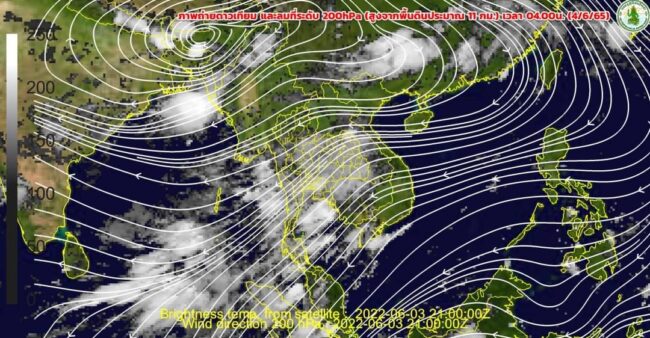วันนี้ (4 มิถุนายน 2565) อุตุนิยมวิทยา ได้พยากรณ์อากาศ 24 ชั่วโมงวันนี้ว่า มีมรสุมตะวันตกเฉียงใต้กำลังปานกลางพัดปกคลุมทะเลอันดามัน ประเทศไทย และอ่าวไทย กับมีหย่อมความกดอากาศต่ำปกคลุมบริเวณประเทศเวียดนามตอนบนและประเทศจีนตอนใต้ ทำให้ประเทศไทยยังคงมีฝนฟ้าคะนองเกิดขึ้นได้ โดยมีฝนตกหนักบางแห่ง บริเวณภาคอีสาน ภาคตะวันออก และภาคใต้ฝั่งตะวันตก ส่วนช่วงวันที่ 5-6 มิถุนายน 2565 พยากรณ์ว่า บริเวณภาคอีสาน ภาคตะวันออก และภาคใต้ฝั่งตะวันตก จะยังคงมีฝนฟ้าคะนองเกิดขึ้นและมีฝนตกหนักบางแห่ง และช่วงวันที่ 7-10 มิถุนายน 2565 หย่อมความกดอากาศต่ำยังปกคลุมบริเวณภาคเหนือ ภาคอีสานตอนบน ประกอบกับมรสุมตะวันตกเฉียงใต้ กำลังปานกลางยังคงพัดปกคลุมอยู่ ทำให้ภาคเหนือและภาคอีสานตอนบนมีฝนเพิ่มขึ้น และมีฝนตกหนักบางแห่ง