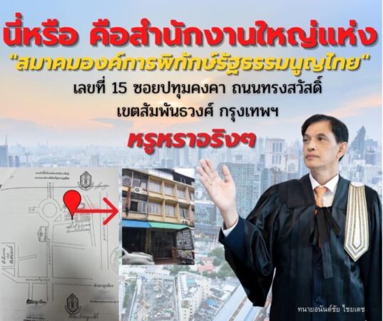 ผมอยากทราบจริงๆ ว่า สมาคมพิทักษ์รัฐธรรมนูญไทย ตั้งอยู่ที่ไหน น่าเชือถือหรือไม่ ??? พบว่า ที่ตั้งของสมาคมองค์การพิทักษ์รัฐธรรมนูญไทยของศรีสุวรรณ จรรยา คือบ้านเลขที่ 15 ซอยปทุมคงคา เขตสัมพันธวงค์ กรุงเทพมหานคร เป็นอาคารพาณิชย์ 3 ชั้น จึงอยากให้ประชาชนช่วยพิจารณาดูว่า หรูหรา น่าเชื่อถือหรือไม่ ? เห็นใช้เป็นสำนักงานแห่งใหญ่ร้องเรียนฯ เยอะแยะมากมาย