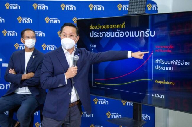 หัวหน้าพรรคกล้า เสนอแนวทางแก้ปัญหาไว้ 3 ข้อ คือ 1.) ควรกำหนดเพดานค่าการกลั่น เพื่อเป็นเครื่องมือป้องกันการค้ากำไรเกินควร พร้อมกำหนดขึ้นต่ำไม่ให้ถึงกับขาดทุน 2.) เสนอเก็บ “ภาษีลาภลอย” (Windfall Tax) เพราะส่วนต่างจากราคาการกลั่นน้ำมัน เป็นราคาลาภลอยให้กับบริษัท ทำให้ได้กำไรจากส่วนต่าง จึงควรเก็บภาษีลาภลอย เพื่อนำกำไรที่เกินมาช่วยเหลือประชาชน นำมาช่วยในกองทุนน้ำมันต่อไป และ 3.) ต้องจริงจังกับมาตรการประหยัดการใช้พลังงาน