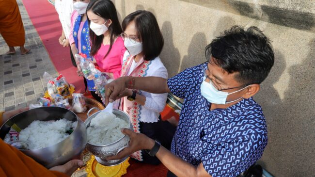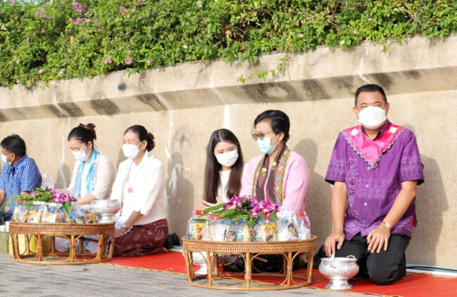 เมื่อเวลา 07.00 น.วันที่ 14 มิ.ย. 2565 ที่บริเวณท่าน้ำสวนเทพปทุมเฉลิมพระเกียรติ ต.บางปรอก อ.เมือง จ.ปทุมธานี นายณรงค์ศักดิ์ โอสถธนากร ผู้ว่าราชการจังหวัดปทุมธานี พร้อมด้วย นายเอกวิทย์ มีเพียร รองผู้ว่าราชการจังหวัดปทุมธานี นายพิษณุ ประภาธนานันท์ นายอำเภอเมืองปทุมธานี นายพงษ์เทพ รุ่งเรือง พัฒนาการจังหวัดปทุมธานี หัวหน้าส่วนราชการ ประชาชนชาวปทุมธานี ร่วมกิจกรรมส่งเสริมการท่องเที่ยววิถีวัฒนธรรม ของจังหวัดปทุมธานี ร่วมกันตักบาตรสืบสานวิถี ไทย รามัญ พระภิกษุ เนื่องในวันพระใหญ่ ขึ้น15 ค่ำเพื่อส่งเสริมให้ข้าราชการ ผู้นำท้องถิ่น และประชาชนทั่วไปได้มีการรักษาศีลตามหลักพระพุทธศาสนา และชูอัตลักษณ์ท้องถิ่นดึงนักท่องเที่ยวสัมผัสวัฒนธรรมริมน้ำเจ้าพระยา เพื่อกระตุ้นการท่องเที่ยวให้กลับมาคึกคักอีกครั้ง