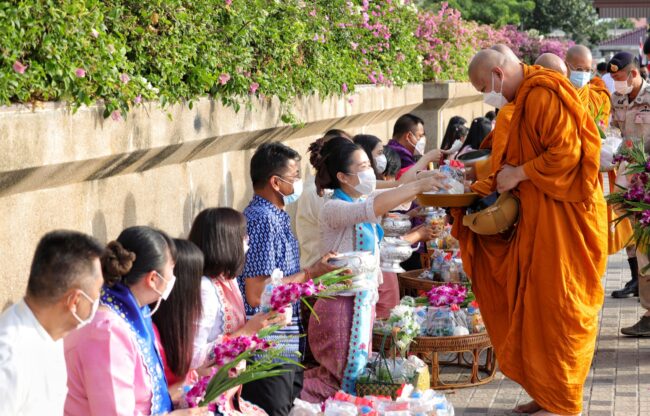 เมื่อเวลา 07.00 น.วันที่ 14 มิ.ย. 2565 ที่บริเวณท่าน้ำสวนเทพปทุมเฉลิมพระเกียรติ ต.บางปรอก อ.เมือง จ.ปทุมธานี นายณรงค์ศักดิ์ โอสถธนากร ผู้ว่าราชการจังหวัดปทุมธานี พร้อมด้วย นายเอกวิทย์ มีเพียร รองผู้ว่าราชการจังหวัดปทุมธานี นายพิษณุ ประภาธนานันท์ นายอำเภอเมืองปทุมธานี นายพงษ์เทพ รุ่งเรือง พัฒนาการจังหวัดปทุมธานี หัวหน้าส่วนราชการ ประชาชนชาวปทุมธานี ร่วมกิจกรรมส่งเสริมการท่องเที่ยววิถีวัฒนธรรม ของจังหวัดปทุมธานี ร่วมกันตักบาตรสืบสานวิถี ไทย รามัญ พระภิกษุ เนื่องในวันพระใหญ่ ขึ้น15 ค่ำเพื่อส่งเสริมให้ข้าราชการ ผู้นำท้องถิ่น และประชาชนทั่วไปได้มีการรักษาศีลตามหลักพระพุทธศาสนา และชูอัตลักษณ์ท้องถิ่นดึงนักท่องเที่ยวสัมผัสวัฒนธรรมริมน้ำเจ้าพระยา เพื่อกระตุ้นการท่องเที่ยวให้กลับมาคึกคักอีกครั้ง