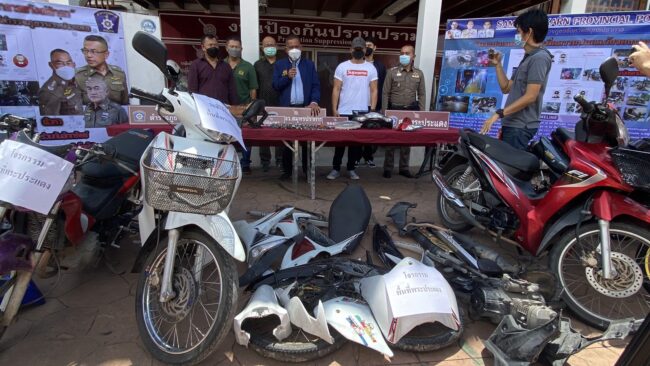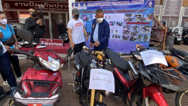 วันที่ 15 มิ.ย.2565 เวลา 13.30น พ.ต.อ.โชติวัฒน์ เหลืองวิลัย รองผบก.ภ.จว.จังหวัดสมุทรปราการ พ.ต.อ.ประเสริฐสุข เฮงสุวรรณ์ ผกก.สภ.พระประแดง พ.ต.ท.ธนกฤต รวยอารี รองผกก.สส.สภ.พระประแดง พ.ต.ท.โทคณชัย มาลัย สว.สส.สภ.พระประแดง ร่วมกันแถลงข่าว แก๊งลักรถจักรยานยนต์ โดยจับกุมผู้ต้องหาได้ 4 คน นายสมรักษ์ นาคแจ่มใส อายุ 22 ปี ที่อยู่ 13 ม.3 ต.บ้านคลองสวน อ.พระสมุทรเจดีย์ จ.สมุทรปราการ นายปรเมศ พืชพันธ์ อายุ 18 ปี ที่อยู่ 6 ม.7 ต.แหลมฟ้าผ่า อ.พระสมุทรเจดีย์ จ.สมุทรปราการ นายวีรภัทร เผือกแตง อายุ 17 ปี เลขประจำตัวประชาชน ที่อยู่ 276/41 ม.1 ต.แหลมฟ้าผ่า อ.พระสมุทรเจดีย์ จ.สมุทรปราการ ด.ช.พิสุทธิ์ สุขสมบัต อายุ 14 ปี เลขประจำตัวประชาชน ที่อยู่ 12 ม.9 ต.บางจาก อ.พระประแดง จ.สมุทรปราการ พร้อมด้วยของกลาง รถจักรยานยนต์ จำนวน 11 คัน 1.รถจักรยานยนต์ยี่ห้อ ฮอนด้า เวฟ สี ขาว ทะเบียน 1 ขร 4135 กทม. จำนวน 1 คัน 2.เครื่องรถจักรยานยนต์ หมายเลขเครื่อง JA14E-1348818 จำนวน 1 คัน 3.รถจักรยานยนต์ยี่ห้อ ฮอนด้า เวฟ 110i สีดำ-แดง หมายเลขเครื่อง จำนวน 1 คัน