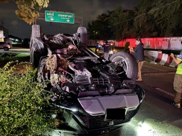 เมื่อเวลา 02.30 น. วันที่ 17 มิ.ย.65 ร.ต.อ.วีระวัฒน์ ไพรปัง รองสารวัตร(สอบสวน)สน.บางเขน รับแจ้งอุบัติเหตุรถยนต์เสียหลักพลิกคว่ำ บนถนนผลาสินธุ์ ก่อนทางลงอุโมงค์ราบ 11 ทิศทางมุ่งหน้าออกถนนพหลโยธิน แขวงอนุสาวรีย์ เขตบางเขน กทม. ตรวจสอบพร้อมอาสาสมัครมูลนิธิร่วมกตัญญู