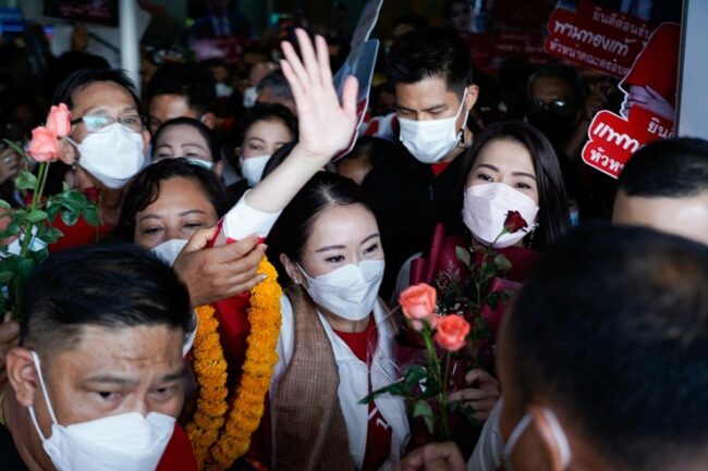 นอกจากนี้ผู้สื่อข่าวรายงานว่า เมื่อเวลา 08.25 น. ทันทีที่ น.ส.แพทองธาร ชินวัตร หรือ “อุ๊งอิ๊ง”หัวหน้าครอบครัวเพื่อไทย นำคณะเพื่อไทย นายพานทองแท้ ชินวัตร พร้อมด้วย นายณัฐวุฒิ ใสยเกื้อ ผู้อำนวยการครอบครัวเพื่อไทย นายประเสริฐ จันทรรวงทอง ส.ส.นครราชสีมา เลขาธิการพรรคเพื่อไทย น.ส.ธีรรัตน์ สำเร็จวาณิชย์ ลงที่สนามบินอุบลฯ ท่ามกลางมีมวลชนสวมเสื้อครอบครัวเพื่อไทยจำนวนมาก พร้อมส.ส.เพื่อไทย หลายจังหวัด รอต้อนรับ ก่อนเดินทางไปที่ศรีสะเกษ โดยประชาชนที่มารอต้อนรับต่างชูป้ายที่มีภาพของ แพทองธาร และ พานทองแท้ ชินวัตร สมาชิกพรรคเพื่อไทยและบุตรชายของ ทักษิณ ชินวัตร อดีตนายกรัฐมนตรี