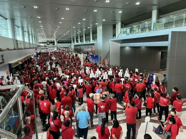 อุบลราชธานี-กลุ่มมวลชนเสื้อแดงพรึ่บสนามบิน ชูป้ายต้อนรับสุดคึกคัก ต้อนรับ ‘อุ๊งอิ๊ง’ หัวหน้าครอบครัวเพื่อไทย บุก ศรีสะเกษ “ไล่หนู ตีงูเห่า” ลงพื้นที่พบประชาชน 3 อำเภอ