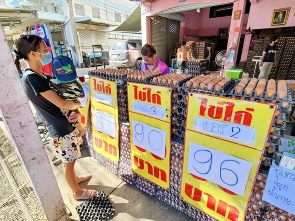 เมื่อวันที่ 21 มิ.ย.2565 นายขจรเกียรติ ผะดาศรี เจ้าของร้านทองประเสริฐ ต.เบิกไพร อ.บ้านโป่ง จ.ราชบุรี ซึ่งเป็นร้านค้าปลีก-ค้าส่งไข่ไก่ที่ใหญ่ที่สุดในภาคตะวันตก เปิดเผยว่า ราคาไข่ไก่ที่ลดลงแล้วเกิดจากปัญหาไข่ไก่ล้นตลาด ทั้งนี้ เมื่อช่วงเดือนเม.ย.ที่ผ่านมา ซึ่งเป็นช่วงที่ราคาไข่ไก่ปรับตัวสูงที่สุดของปี ราคาค้าปลีกไข่ไก่เบอร์ 0 อยู่ที่แผงละ 128 บาท, เบอร์ 1 ราคา 116 บาท, เบอร์ 2 ราคา 113 บาท, เบอร์ 3 ราคา 107 บาท และเบอร์ 4 ราคา 100 บาท