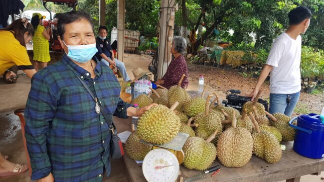 เมื่อวันที่ 27 มิ.ย.65 ทีมข่าวไปดูเกษตรกรชาวสวนทุเรียนอินทรีย์ ของนางแววตา ลองจำนงค์ อายุ 56 ปี บ้านเลขที่ 128 หมู่ 2 บ้านทุ่งคำหลวง ตำบลท่ามะไฟหวาน อำเภอแก้งคร้อ จังหวัดชัยภูมิ บนเทือกเขาภูแลน ต.ท่ามะไฟหวาน อ.แก้งคร้อ จ.ชัยภูมิ ที่บรรดาเจ้าของสวนกำลังขึ้นตัดเก็บลูกทุเรียนรุ่นแรก ที่มีขนาดแก่จัดพอเหมาะในการตัดส่งลูกค้าที่สั่งจองเข้ามาตั้งแต่ต้นปี ได้พบกับลูกค้าซึ่งเป็นท่องเที่ยว เดินทางมาจาก จ.ขอนแก่นกว่า 5 คน ที่เจ้าของสวนกำลังปลอกลูกทุเรียนให้ลูกค้า นักท่องเที่ยวยืนรอชิม
