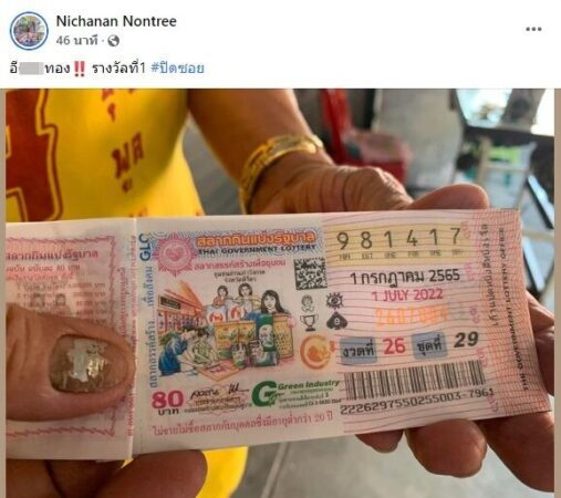 ล่าสุด ได้มีสมาชิกเฟซบุ๊ก “Nichanan Nontree” โพสต์ภาพลอตเตอรี่หมายเลข 981417 งวดประจำวันที่ 1 ก.ค.65 ซึ่งตรงกับรางวัลที่ 1 พร้อมระบุข้อความว่า “อี…ทอง รางวัลที่1 #ปิดซอย” หลังโพสต์ดังกล่าวเผยแพร่ไป ก็มีคนเข้ามาแสดงความยินดีด้วยเป็นจำนวนมาก