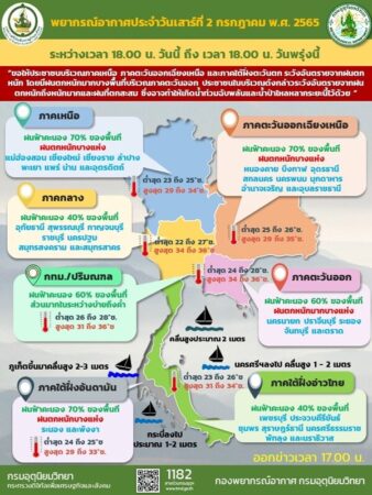 เมื่อวันที่ 3 ก.ค.2565 กรมอุตุนิยมวิทยา พยากรณ์อากาศ 24 ชั่วโมงข้างหน้า ประเทศไทยยังคงมีฝนตกต่อเนื่อง และมีฝนตกหนักบางแห่งบริเวณภาคเหนือตอนบน ภาคตะวันออกเฉียงเหนือ และภาคใต้ฝั่งตะวันตก โดยมีฝนตกหนักมากบางพื้นที่บริเวณภาคตะวันออก ขอให้ประชาชนในบริเวณดังกล่าวระวังอันตรายจากฝนตกหนักถึงหนักมากและฝนที่ตกสะสม ซึ่งอาจทำให้เกิดน้ำท่วมฉับพลันและน้ำป่าไหลหลากได้