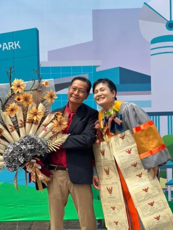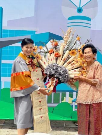 นครราชสีมา-เซอร์ไพรส์..สาวรับปริญญา ป.โท มทส.โคราช สามีและลูกนำโฉนดที่ดินเมืองนนฯ 20 กว่าฉบับ ทำเป็นช่อดอกไม้ พร้อมมาลัยคล้องคอ แสดงความยินดี