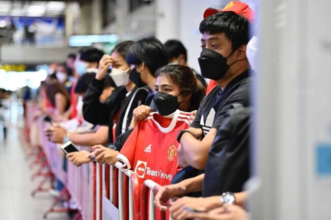 เมื่อเวลา 10.45 น.บรรยากาศที่สนามบินดอนเมืองคึกคักสุดเมื่อเหล่าสาวก”ผีแดง”แห่กรี๊ดต้อนรับนักเตะแมนเชสเตอร์ ยูไนเต็ด เดินทางถึงประเทศไทย