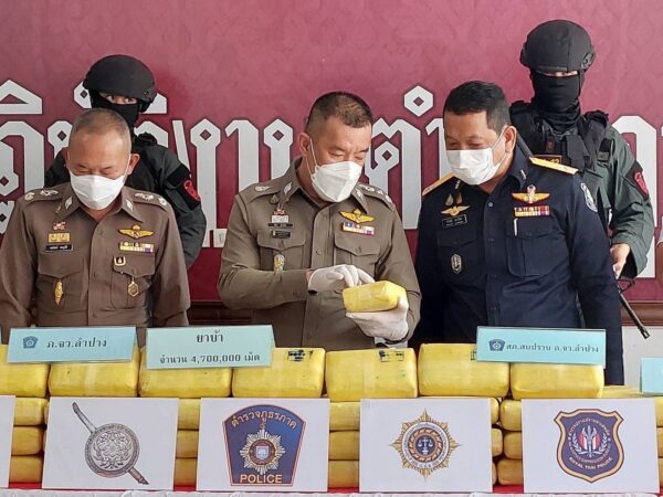 เมื่อเวลา 11.00 น. วันที่ 10 ก.ค. 65 พล.ต.ท.ปิยะ ต๊ะวิชัย ผบช.ภ.5 พร้อมด้วยเจ้าหน้าที่เกี่ยวข้อง ได้ร่วมกันแถลงผลการจับกุมยาเสพติดรายสำคัญ ยาบ้า จำนวน 4.7 ล้านเม็ด ผู้ต้องหา 4 คน รถยนต์ 2 คัน ที่ทางเจ้าหน้าที่สามารถสกัดจับได้เมื่อ วันที่ 6 ก.ค. ที่ผ่านมา ขณะลำเลียงยาเสพติดทั้งหมดผ่านบริเวณถนนเถิน-แม่พริก (สายเก่า) ต.แม่พริก อ.แม่พริก จว.ลำปาง