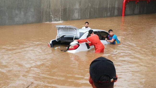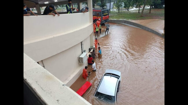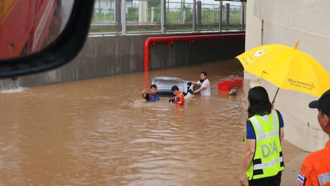 ต่อมาในเวลา 17.10 น. เวรอำนวยการบิน ท่าอากาศยานขอนแก่น ได้รับแจ้งเหตุว่ามีรถผู้ใช้บริการจมน้ำ บริเวณถนนด้านหลังอาคารจอดรถยนต์หลังใหม่ เวรอำนวยการบินและเจ้าหน้าที่กู้ภัยและดับเพลิงอากาศยาน จึงนำรถดับเพลิงอากาศยาน เข้าถึงที่เกิดเหตุทันที พบว่า เจ้าของรถที่จมน้ำเป็น คุณแม่และลูกสาว ได้สอบถามและทราบว่าจะมารับญาติที่ลงเครื่องบิน เนื่องจากฝนตกหนักมองเห็นทางไม่ชัด จึงได้ขับหลงเข้าไปทางที่ได้ปิดไว้ (ท่าอากาศยานขอนแก่นปิดเส้นทางถนนดังกล่าวโดยใช้กรวยจราจรพลาสติกเนื่องจากมีน้ำปริมาณมากและมีลมแรง จึงได้พัดพากรวยจราจรออกจากจุดที่ตั้งกั้นปิดถนน) โดยตนเองมองเห็นน้ำขังอยู่บนถนน และคิดว่าระดับน้ำจะไม่สูง จึงขับรถตรงเข้าไป จนทำให้รถลอยน้ำไม่สามารถถอยออกมาได้ ตนจึงรีบพาลูกสาวออกจากรถและรอความช่วยเหลือ