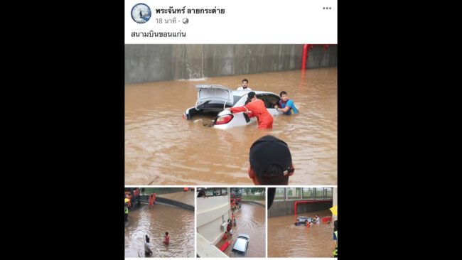 โลกโซเชียลมีเดียและเพจต่างๆทั่วทั้ง จ.ขอนแก่น ได้เผยแพร่ภาพจากเฟชบุ๊ก “พระจันทร์ ลายกระต่าย” ที่ได้โพสต์ภาพน้ำฝนท่วมสูงในสนามบิน พร้อมภาพรถเก๋งสีขาวคันหนึ่งจมอยู่ใต้น้ำ ทางเข้าลานจอดรถ ระดับน้ำสูงเกือบมิดหลังคารถเก๋ง โดยเจ้าหน้าที่ของท่าอากาศยานนานาชาติขอนแก่นได้เข้าให้การช่วยเหลือคนขับและผู้โดยสารมาอีกหนึ่งทราบภายหลังเป็นแม่กับลูกสาว ก่อนที่ทางเจ้าหน้าที่จะลากรถเก๋งของสองแม่ลูกขึ้นมาจากน้ำโดยไม่มีใครได้รับบาดเจ็บ