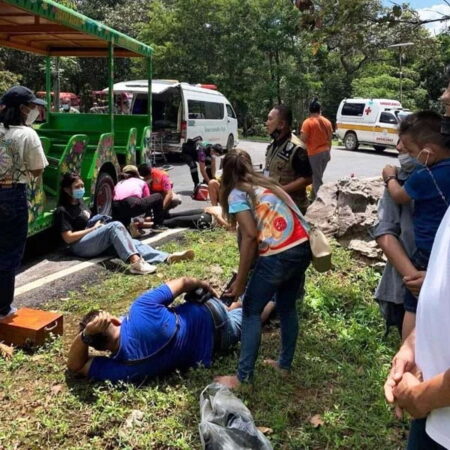 ชัยภูมิ- รถรางขนนักท่องเที่ยวขึ้นชมทุ่งดอกกระเจียว อุทยานฯป่าหินงาม อ.เทพสถิต เฉี่ยวชนกันกันพลิกคว่ำ บาดเจ็บระนาว 15 ราย สาหัส 2 ราย