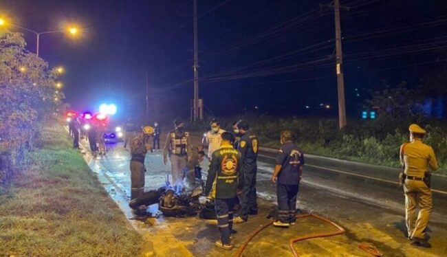 ลำพูน-หนุ่มวัย 27 ปีควบบิ๊กไบก์ชนท้ายกระบะ ไฟลุกท่วม เจ้าหน้าที่ช่วยปั๊มหัวใจยื้อชีวิต แต่สุดท้ายดับสลด คาดขี่มาเร็วก่อนชนท้ายกระบะ จนกระเด็นตกข้างทาง