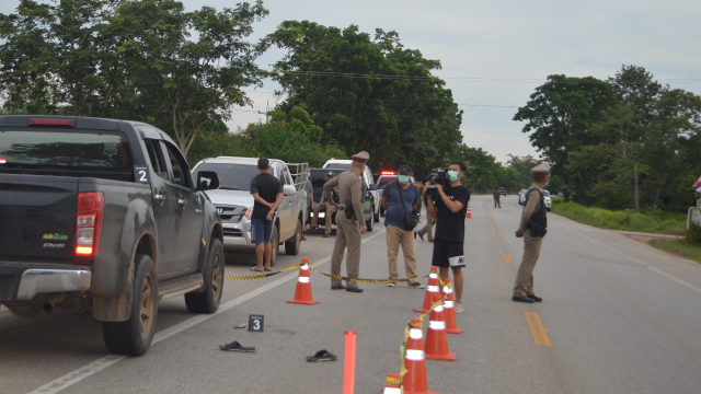 ที่เกิดเหตุพบรถยนต์กระบะ 2 คัน จอดอยู่ คันแรกเป็นรถยนต์กระบะยี่ห้ออีซูซุ สีดำ ทะเบียน กทม. ข้างรถพบปืนขนาด .38 ตกอยู่ ส่วนอีกคันเป็นรถกระบะยี่ห้ออีชูชุ สีขาว ทะเบียน สระแก้ว จากการสอบถามทราบว่าผู้บาดเจ็บ จำนวน 3 ราย ถูกเจ้าหน้าที่กู้ภัยมูลนิธิร่วมกตัญญู จุดโคกสูง นำส่ง รพ.ตาพระยาไปก่อนนี้แล้ว