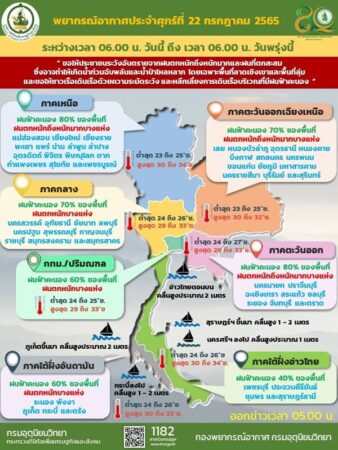 เมื่อวันที่ 22 ก.ค.2565 กรมอุตุนิยมวิทยา พยากรณ์อากาศ 24 ชั่วโมงข้างหน้า ร่องมรสุมกำลังแรงพาดผ่านภาคเหนือตอนล่าง ภาคกลาง ภาคตะวันออก และภาคตะวันออกเฉียงเหนือตอนล่าง ประกอบกับมรสุมตะวันตกเฉียงใต้ที่พัดปกคลุมทะเลอันดามัน ภาคใต้ และอ่าวไทยมีกำลังปานกลาง