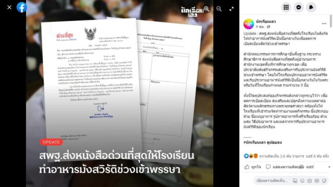 เฟซบุ๊กที่ใช้ชื่อว่า “นักเรียนเลว” เผยแพร่หนังสือจากสำนักงานคณะกรรมการการศึกษาขั้นพื้นฐาน กระทรวงศึกษาธิการ เรื่อง ประชาสัมพันธ์กิจกรรมส่งเสริมการรับประทานอาหารมังสวิรัติ ในช่วงเข้าพรรษา “กินดี มีบุญ เข้าพรรษา 2565″ ถึงผู้อำนวยการเขตพื้นที่การศึกษาทุกเขต โดยเฟซบุ๊กดังกล่าวระบุว่า ” สพฐ.ส่งหนังสือด่วนที่สุดถึงโรงเรียนในสังกัดให้ทำอาการมังสวิรัตเป็นมื้อกลางวันเพื่อลดการเบียดเบียนสัตว์ช่วงเข้าพรรษา