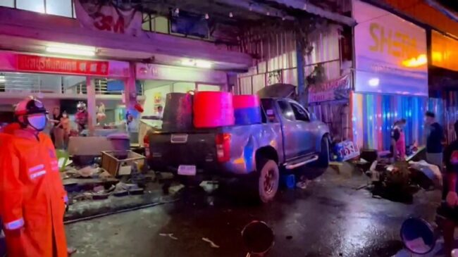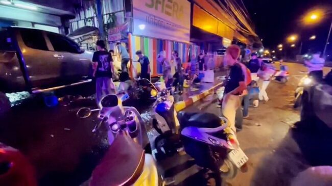 จันทบุรี-กระบะเสียหลักพุ่งชน ร้านก๋วยเตี๋ยว-ร้านยำกลางเมืองจันทบุรี ลูกค้าบาดเจ็บเกลื่อนถนน 17 ราย เจ้าหน้าที่เร่งช่วยเหลือ เผย คนขับอาศัยช่วงชุลมุนหลบหนี
