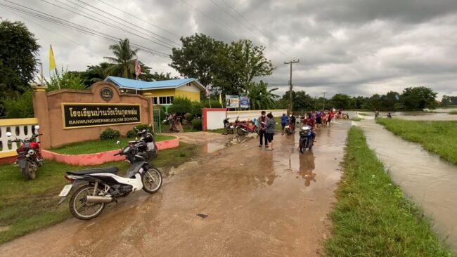 เมื่อเวลา 17.30 น.วันที่ 10 ก.ย. 2565 ผู้สื่อข่าว ลงพื้นที่ไปที่บ้านวังเงิน ม.8 ต.ศรีบุญเรือง อ.ชนบท จ.ขอนแก่น ซึ่งเป็นจุดที่ถูกน้ำท่วมและน้ำกัดเซาะถนน รถไม่สามารถสัญจรไปมาได้ เมื่อไปถึงจุดดังกล่าว พบว่า มีน้ำท่วมสองข้างทางที่เป็นทุ่งนาเป็นบริเวณกว้างและไหลแรง โดยน้ำไหลจากทางทิศเหนือลงไปยังทิศใต้ เป็นระยะทางประมาณ 500 เมตร และถนนขาด อบต.ศรีบุญเรืองได้น้ำกระสอบทรายและสะพานเหล็กมาวางในจุดที่ถนนขาดให้ชาวบ้านเดินข้ามไปมาได้ ซึ่งจุดที่น้ำท่วมหนักอยู่ติดกับโรงเรียนบ้านวังเวินกุดหล่ม และนอกจากนี้ยังพบว่าที่บริเวณข้างถนนด้านหน้าโรงเรียน มีรถยนต์และรถจักรยานยนต์ จอดอยู่จำนวนมาก ชาวบ้านจอดรถไว้ข้างทางแล้วขนเอาสิ่งของสำคัญ กับข้าวและสัตว์เลี้ยง เดินลุยน้ำข้ามกลับเข้าไปในหมู่บ้าน