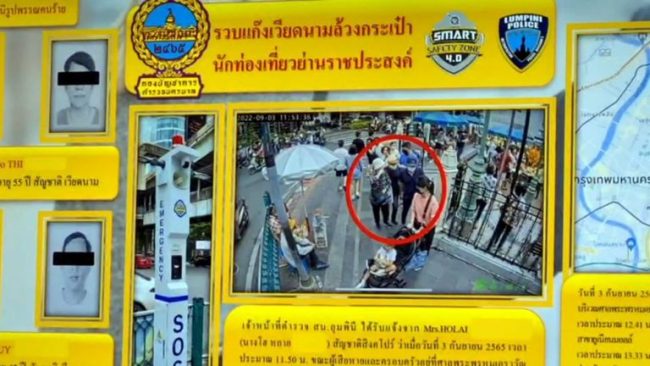 พ.ต.อ.นิมิตร กล่าวว่า เมื่อวันที่ 3 กันยายนที่ผ่านมา เจ้าหน้าที่ตำรวจ สน.ลุมพินี ได้รับแจ้งจากศูนย์รับแจ้งเหตุโครงการ SMART SAFETY ZONE 4.0 ผ่านระบบ SOS ว่าขณะที่ Mrs.HOLAI FUNG ELISIE (นางโฮ หลาย ฟัง เอลซี) สัญชาติสิงคโปร์ และครอบครัวอยู่ที่ศาลพระพรหมเอราวัณ ได้มีคนร้ายจำนวน 3 คน มาล้วงกระเป๋าผู้เสียหายได้ทรัพย์สินเป็นเงินสดธนบัตรดอลล่าร์สิงคโปร์ จำนวน 1,700 ดอลล่าร์ (คิดเป็นเงินไทยประมาณ 44,455 บาท) และบัตรเครดิต จำนวน 3 ใบ จากนั้นได้หลบหนีไป