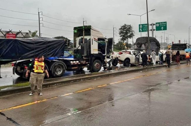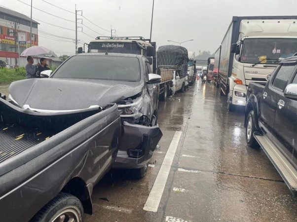 ฝนตกถนนลื่นชนสนั่น 7 คันรวด รถยนต์-บรรทุก ยับ แยกดังลำพูน เจ็บเล็กน้อย