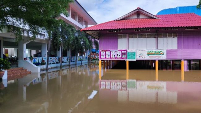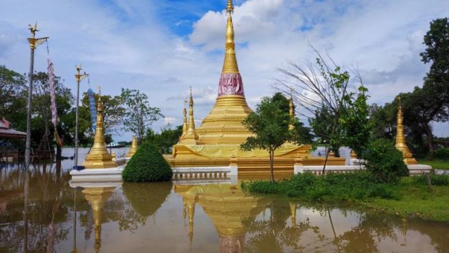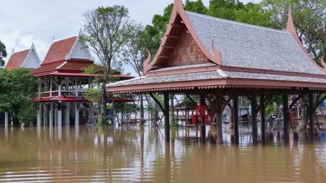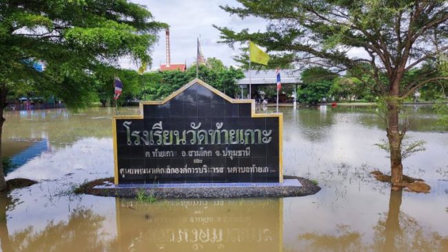 ปทุมธานี-แม่น้ำเจ้าพระยาล้นทะลักท่วมชุมชนมอญตำบลท้ายเกาะ อำเภอสามโคก สูงกว่า 70 ซม. พระเณรใช้เรือออกบิณฑบาต-โรงเรียมจมน้ำ