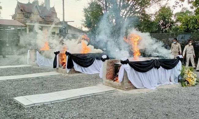 เวลา 17.00 น. ที่วัดเทพมงคลพิชัย ซึ่งมีนายสุพัฒนพงษ์ พันธ์มีเชาว์ รองนายกรัฐมนตรี เป็นประธานในพิธี ได้พิธีเผาศพ จำนวน 3 ศพ บริเวณเชิงตะกอนแล้ว และจะมีการเก็บเถ้าอัฐิผู้เสียชีวิตทั้ง 3 ในเวลา 03.00-06.00 น เพื่อนำไปประกอบพิธีทางศาสนาที่บ้าน