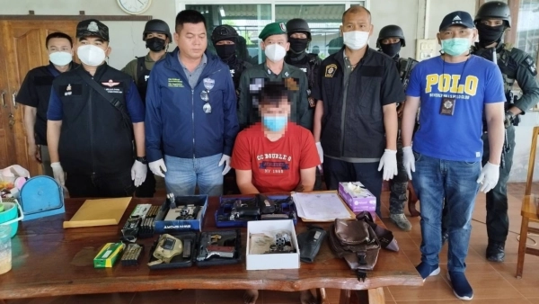 จุดที่ 3 เข้าค้นบ้านเลขที่ 99/3 ม.7 ต.ทุ่งควายกิน อ.แกลง จว.ระยอง ตามหมายค้นศาลจังหวัดระยองที่ 170/2565 ลงวันที่ 14 ต.ค.จับกุมนายสุทธิพันธ์ มั่นคง อายุ 26 ปี อยู่ที่ 99/3 ม.7 ต.ทุ่งควายกิน อ.แกลง จ.ระยอง พร้อมด้วยของกลางอาวุธปืนแบบกึ่งอัตโนมัติ ขนาด 9 มม. ยี่ห้อสมิทแอนด์เวสสัน ทะเบียน กท3930667 จำนวน 1 กระบอก ซองบรรจุกระสุนปืน 1 อัน อาวุธปืนลูกโม่ ยี่ห้อสมิทแอนด์เวสสัน ขนาด .38 ทะเบียน กท37902395 จำนวน 1 กระบอก อาวุธปืนดัดแปลงแบบกึ่งอัตโนมัติ ขนาด 380 ยี่ห้อคิมเบอ เลขตัวปืน เค 47189 จำนวน 1 กระบอก ซองบรรจุกระสุน 1 อัน อาวุธดัดแปลงแบบลูกโม่ ขนาด 32 ไม่มียี่ห้อ เลขตัวปืน 18004777 จำนวน 1 กระบอก ไฟเครื่องกระสุนปืนขนาด .380 จำนวน 44 นัด เครื่องกระสุนปืนขนาด .38 จำนวน 42 นัด เครื่องกระสุนปืนขนาด .32 จำนวน 11 นัด เครื่องกระสุนปืนขนาด 9 มม.จำนวน 42 นัด อยู่ในชั้นเก็บของในห้องพัก นายสุทธิพันธ์ รับสารภาพว่า ชอบสะสมปืน ดูจากโลกออนไลน์ สั่งซื้อจากยูทูบช่างทำมือ จากนั้นได้ควบคุมตัวผู้ต้องหา พร้อมของกลางส่งพนักงานสอบสวน สภ.แกลง ดำเนินคดี