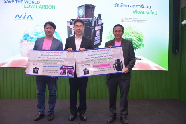 สำหรับหม้อแปลงใต้น้ำ “ซับเมอร์ส Low Carbon” หม้อแปลงใต้น้ำ ติดตั้งใต้ดิน เกิดจากการวิจัยและพัฒนาของ บริษัท เจริญชัยหม้อแปลงไฟฟ้า จำกัด ได้สร้างผลงานโครงการสนับสนุนกิจกรรมลดก๊าซเรือนกระจก (LESS) ประเภทด้านการเพิ่มประสิทธิภาพพลังงาน ของหม้อแปลง Low Carbon ที่มีระบบบริหารจัดการพลังงานสิ้นเปลืองแบบเรียลไทม์ ซึ่งเป็นเทคโนโลยีที่ช่วยบริหารจัดการพลังงานไฟฟ้าภายในสถานประกอบการให้อยู่ในระดับพลังงานที่เหมาะสมและเสถียรภาพ