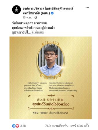 นิสิตจุฬาฯสุดทน แฉ “อบจ” โพสต์ ทรงพระเจริญ ฉลองวันเกิด “โจชัว หว่อง” ตรงวันคล้ายวันสวรรคต ร.9 จ้างรถสามล้อติดโปสเตอร์ตระเวนทั่วกรุง จี้จนท.รัฐสั่งลบข้อความและภาพทิ้ง ตรวจสอบแหล่งที่มา พร้อมดำเนินคดีม.112 เรียกร้องอธิการบดีชี้แจงด่วน หวั่นจุฬาฯตกเป็นเครื่องมือทางการเมือง