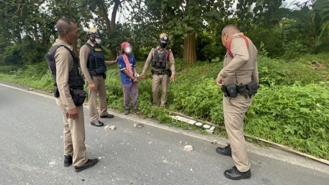ที่เกิดเหตุริมถนนสายเพชรเกษม พบนายสมชาย บัวแก้ว หรืออ้ายตู่ อายุ 34 ปี คลุ้มคลั่งอยู่ในอาการลุกลี้ลุกลน ถือมีดพร้าและมีดกรีดยางอยู่ในมือ ก่อนเจ้าหน้าที่จะเข้าจับกุม โดยนายสมชาย หรือตู่ ได้ให้เจ้าหน้าที่ตำรวจจับกุมใส่กุญแจมือแต่โดยดี ก่อนจะให้นายสมชาย ไปชี้จุดที่ก่อเหตุ ทำลายเสาป้าบอกทางริมถนนพังเสียหาย พร้อมทั้งถอดเสาขึ้นมาจากดิน จำนวน 2-3 เสา ซึ่งเป็นทรัพย์สินของทางราชการ และนำไปชี้จุดบริเวณภายสวนยางพาราของชาวบ้าน หลังจากที่นายสมชาย ได้บุกเข้าไปเดินเหยียบ และถอนต้นยางพารา อายุ 2 เดือน กว่า 100 ต้นเสียหาย มูลค่าความเสียหายประมาณ 5,000 – 10,000 บาท