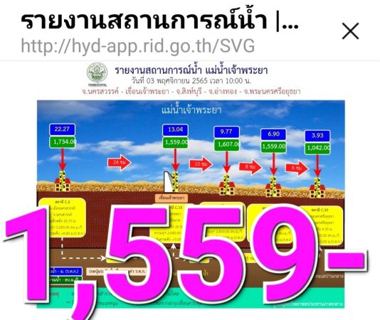 ล่าสุดเมื่อวันที่ 3 พ.ย.65 เขื่อนเจ้าพระยา จังหวัดชัยนาท ปล่อยระบายน้ำลดลง อยู่ที่ 1,559 ลบ.ม./วินาที ทำให้ระดับน้ำในพื้นที่จังหวัดพระนครศรีอยุธยา ในหลายอำเภอ โดยเฉพาะชุมชน ซึ่งตั้งติดกับแม่น้ำเจ้าพระยา และลำคลองบางหลวง มีระดับน้ำท่วมลดลงอย่างต่อเนื่อง