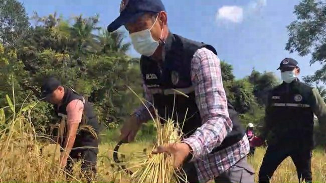 บูรณาการร่วมลงพื้นที่ลงแขกเกี่ยวข้าวช่วยเหลือเกษตรกรชาวนา ช่วงขาดแคลนแรงงาน แบ่งเบาภาระของชาวนา ประหยัดค่าใช้จ่าย ลดต้นทุนการผลิตให้กับชาวนาที่จะต้องจ่ายค่าจ้างในการเกี่ยวข้าว จำนวน 3 ไร่