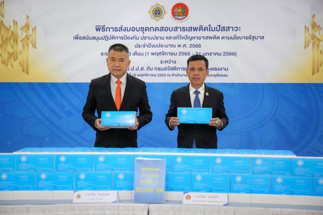 วันที่ 10 พฤศจิกายน 2565 นายวิชัย ไชยมงคล เลขาธิการคณะกรรมการป้องกันและปราบปรามยาเสพติด (เลขาธิการ ป.ป.ส.) มอบชุดตรวจสารเสพติด ให้กับนายนิยม สองแก้ว อธิบดีกรมสวัสดิการและคุ้มครองแรงงาน จำนวน 50,000 ชุด และระดมพลังความร่วมมือจากผู้ประกอบการในการดำเนินการค้นหาผู้เสพผู้ติดเพื่อให้การช่วยเหลือบำบัดฟื้นฟูและป้องกันการเข้าไปเกี่ยวข้องกับยาเสพติดทั้งในมิติการเสพและการค้า ณ สำนักงาน ป.ป.ส. (ดินแดง)