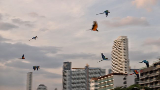นกหลายชนิด หลากสีสัน บินทั่วท้องฟ้าอย่างเป็นอิสระ ไร้ซึ่งการผูกมัดและไม่ถูกพันธนาการไว้ในกรงขัง แต่เมื่อได้ยินเสียงสัญญาณหรือถูกเรียกโดยเจ้าของมันจะรีบโผเข้าหาอย่างคุ้นเคย