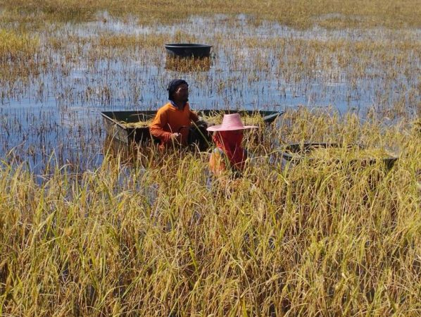 ยโสธร-เกษตรกรเมืองปั้งไฟต้องลุยน้ำลึกเกี่ยวข้าวทั้งน้ำตาก ผลผลิตจมกว่า 1.50 เมตรซึ่งต้องเร่งเกี่ยวนำถังที่ผสมปูนใส่ข้าวล่องน้ำขึ้นมาสีแล้วค่อยนำไปตากแดดเพื่อให้เม็ดข้าวเปลือกแห้งก่อนนำไปเก็บไว้หรือนำไปขายที่โรงสีใช้หนี้