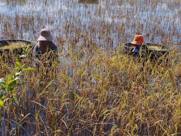 หรืออาศัยแรงงานเพื่อนบ้านมาลุยน้ำเกี่ยวข้าวช่วยกัน และข้าวที่เกี่ยวก็ต้องเอาถังที่ผสมปูนใส่ข้าวล่องน้ำขึ้นมาสีแล้วค่อยนำไปตากแดดเพื่อให้เม็ดข้าวเปลือกแห้งก่อนนำไปเก็บไว้หรือนำไปขายที่โรงสี นอกจากการเก็บเกี่ยวที่อยากลำบากแล้วเมื่อนำไปขายยังถูกกดราคาจากผู้ประกอบการโรงสีที่รับซื้อข้าวอีกแต่ชาวบ้านจำเป็นต้องขายเพราะหนี้สิน