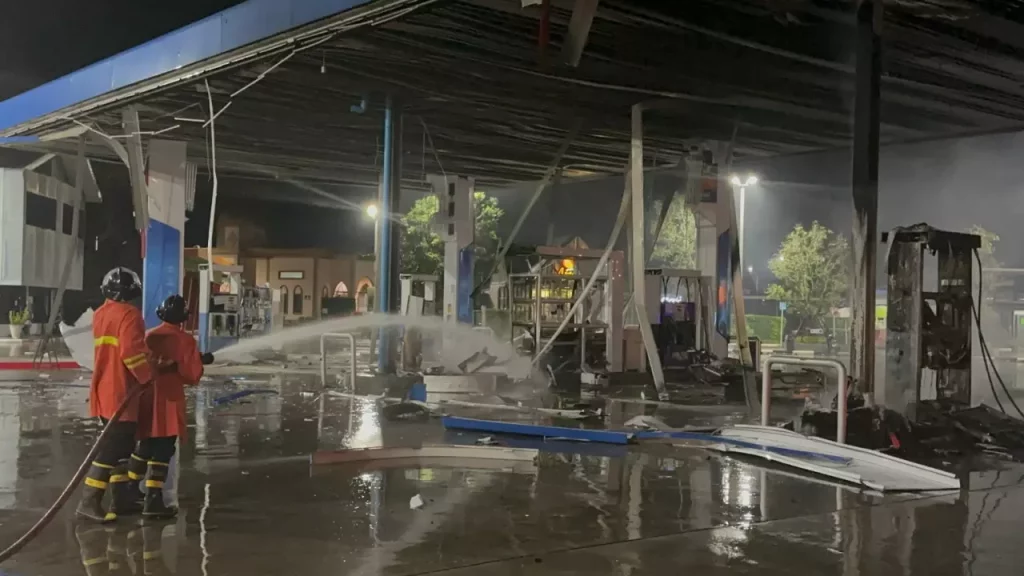 เมื่อไปถึงเจ้าหน้าที่ได้ปิดพื้นที่เกิดเหตุทันที เนื่องจากมีเพลิงกำลังลุกไหม้บริเวณหัวจ่ายน้ำมัน จำนวน 2 จุดอย่างรุนแรง เกรงว่าจะเกิดเหตุรุนแรงขึ้น เจ้าหน้าที่ดับเพลิงระดมฉีดน้ำใช้เวลาร่วม 20 นาทีจึงสามารถควบคุมเพลิงไว้ได้ จากการตรวจสอบ หลังเกิดเหตุพบว่าแรงระเบิดทำให้หัวจ่ายน้ำมัน จำนวน 4 จุดได้รับความเสียหายอย่างหนัก สภาพตัวอาคารของปั๊มน้ำมันถูกแรงระเบิดจนฝาหลังคาได้รับความเสียหาย แรงระเบิดยังทำให้ห้องแคชเชียร์ของปั๊มถูกเพลิงไหม้เสียหาย อาคาร กระจกร้านสะดวกซื้อเซเว่น ร้านกาแฟได้รับความเสียหายจากสะเก็ดระเบิดไปด้วยเช่นกัน