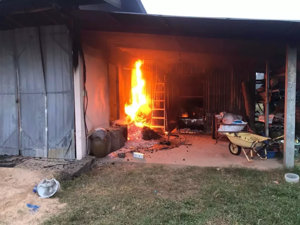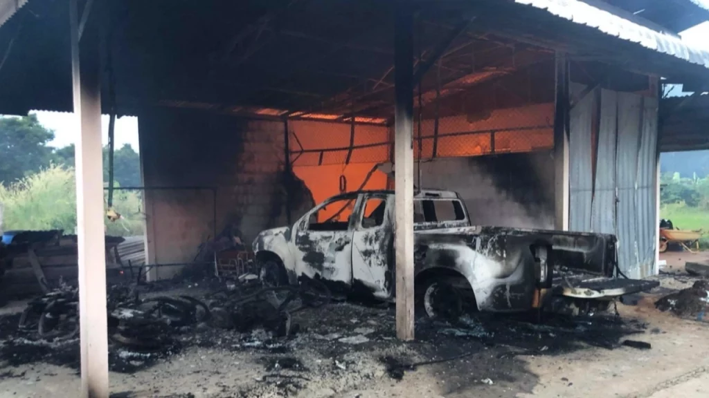 ที่เกิดเหตุเป็นบ้านทรงไทย 1 หลัง โรงจอดรถและยุ้งข้าว เจ้าหน้าที่จึงระดมฉีดน้ำเพื่อดับไฟใช้เวลาประมาณ 1 ชั่วโมงจึงสามารถคุมเพลิงไว้ได้ ตรวจบริเวณที่เกิดเหตุพบเพลิงไหม้บ้าน โรงจอดรถ และรถกระบะเสียหายทั้งหมด พบหัวกระสุนตกในพื้นที่เกิดเหตุ 1 หัว