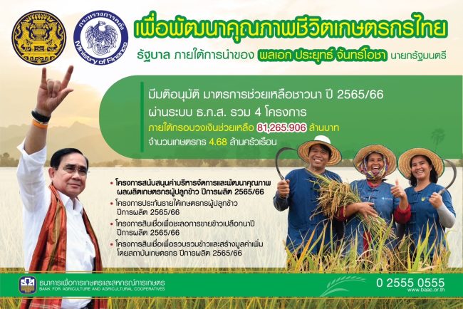 บอร์ด ธ.ก.ส. เห็นชอบดำเนินการจ่ายเงินช่วยเหลือเกษตรกรผู้ปลูกข้าว พร้อมมาตรการคู่ขนานตามนโยบายรัฐบาล เพื่อรักษาเสถียรภาพราคาข้าวเปลือกและยกระดับรายได้เกษตรกรผู้ปลูกข้าวอย่างยั่งยืน วงเงิน 81,265 ล้านบาท ผ่านโครงการสนับสนุนค่าบริหารจัดการและพัฒนาคุณภาพผลผลิตเกษตรกรผู้ปลูกข้าว ปีการผลิต 2565/66 ในอัตราไร่ละ 1,000 บาท สูงสุดไม่เกิน 20 ไร่ โครงการประกันรายได้เกษตรกรผู้ปลูกข้าว ปีการผลิต 2565/66 โครงการสินเชื่อชะลอการขายข้าวเปลือกนาปี และโครงการสินเชื่อเพื่อรวบรวมข้าวและสร้างมูลค่าเพิ่มโดยสถาบันเกษตรกร ปีการผลิต 2565/66 เป้าหมายเกษตรกรได้รับประโยชน์กว่า 4.68 ล้านครัวเรือน เริ่มโอนเงินเข้าบัญชีเกษตรกรตั้งแต่ 24 พ.ย. 65 เป็นต้นไป โดยมีนายกรัฐมนตรี เป็นประธานการโอนเงินวันแรก