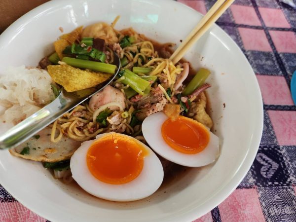 รับรอง แต่ละชามอิ่มอร่อย อัดแน่นด้วยเครื่อง ทั้ง เนื้อหมู ลูกชิ้นไข่ต้มยางมะตูม หลากหลายเส้นตามใจเลือก ทั้ง เส้นใหญ่ เส้นเล็ก หมี่เหลือง หมี่ขาว มาม่า ไวไว และ เครื่องดื่มเด็ดๆเข้ม! ตามสั่ง พร้อมยกมาบริการลูกค้าด้วยตัวเจ้าของร้าน2สามี-ภรรยา นายณัฐฐาพงษ์ หรือ แป๊ะ กับมลรัตน์ดา แสงสุภาภัทจำนง อายุ 51 ปีทั้งคู่ ดูเมนูแรกในร้าน ที่ลูกค้าสั่งมากสุดกัน คือ เย็นตาโฟ ที่ซดคล่องคอ ร้อนๆ น้ำซุปปรุงเลิศรสเดือดพล่านตลอดกันก่อน
