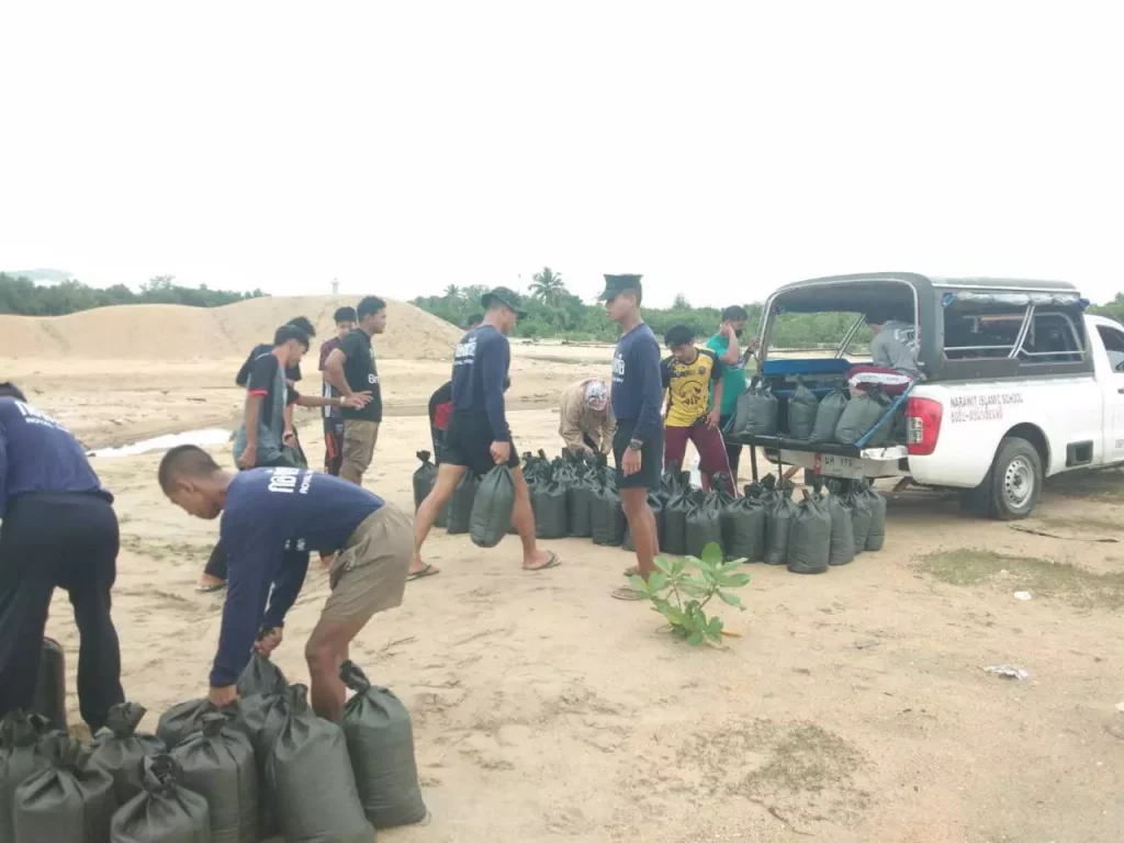 ด้านหน่วยเฉพาะกิจนาวิกโยธินกองทัพเรือ 33 ภายใต้การสั่งการโดย นาวาโท อำนาจ ภู่ทอง ผู้บังคับหน่วยฯ พร้อมด้วยกำลังพลนาวิกโยธินฯ และนักเรียนของโรงเรียนนราวิทย์อิสลามวิทยา ตำบลบางนาค อำเภอเมือง จังหวัดนราธิวาส ร่วมด้วยช่วยกันบรรจุทรายลงกระสอบ เพื่อเตรียมกระสอบทรายไว้ล่วงหน้า เนื่องจากสภาวะฝนที่ยังคงตกติดต่อกันเป็นเวลาหลายวัน ตั้งแต่วันที่ 8 ธันวาคม 2565 เป็นต้นมา เพื่อที่จะนำไปวางเป็นแนวกั้นน้ำที่จะทะลักเข้าท่วมอาคารเรียนของโรงเรียนนราวิทย์อิสลามวิทยา