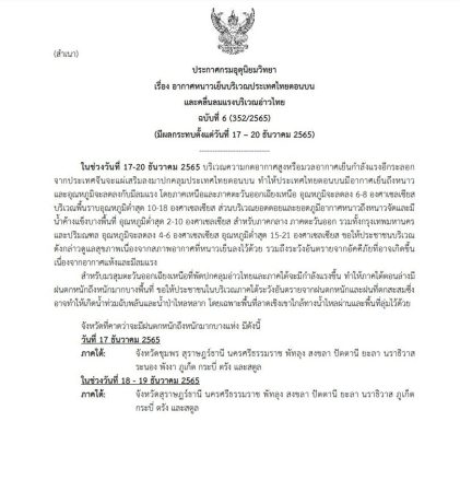 เมื่อเวลา 05.00 น. วันที่ 17 ธ.ค.65 กรมอุตุนิยมวิทยา ประกาศกรมอุตุนิยมวิทยา เรื่อง อากาศหนาวเย็นบริเวณประเทศไทยตอนบน และคลื่นลมแรงบริเวณอ่าวไทย ฉบับที่ 6 (352/2565) (มีผลกระทบตั้งแต่วันที่ 17 – 20 ธันวาคม 2565) ความว่า ในช่วงวันที่ 17-20 ธันวาคม 2565 บริเวณความกดอากาศสูงหรือมวลอากาศเย็นกำลังแรงอีกระลอกจากประเทศจีนจะแผ่เสริมลงมาปกคลุมประเทศไทยตอนบน ทำให้ประเทศไทยตอนบนมีอากาศเย็นถึงหนาว และอุณหภูมิจะลดลงกับมีลมแรง