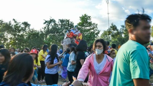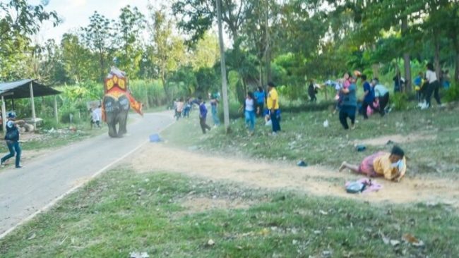 แต่ปรากฎว่ามีช้าง 1 เชือกเป็นเพศเมีย อายุประมาณ 5 ปี กระโจนแหวกออกจากขบวนวิ่งฝ่าชนและเหยียบชาวบ้าน ซึ่งพากันวิ่งหนีด้วยความตกใจ บางคนสูงวัยวิ่งสะดุดล้มหน้าคมำ ก่อนถูกพาส่งรพ. 10 คน มีหญิงเจ็บสาหัส 1 คน ถูกช้างเหยียบเข้าที่สะโพก