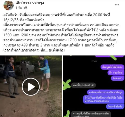 โดยข้อความระบุว่า “สวัสดีครับ วันนี้ผมจะขอรีวิวเหตุการณ์ที่พึ่งเจอกับตัวเองเมื่อ 20.00 วันที่ 16/12/65 ที่สะปันแห่งหนึ่ง เนื่องจากเราเป็นคน จ.น่านที่มีเพื่อนๆมาเที่ยวน่านครั้งแรก เราเลยเป็นคนพามาเที่ยวเพราะบ้านเราสวยมาก บรรยากาศดี เพื่อนได้จองที่พักไว้ 2 หลัง หลังละ 1500 และ 1200 บาท ก่อนเข้าพักทางที่พักได้แจ้งกฎชัดเจนว่าห้ามนำอาหารจากข้างนอกมาทาน เราก็ได้สั่งอาหารก่อน 17.00 ตามกฎทางที่พัก เราสั่งหมูกะทะชุดละ 499 สำหรับ 2 ท่าน และเพิ่มขุดเสริมอีก 1 ชุดกลัวไม่อิ่ม พอถึงเวลาที่พักก็เอามาส่งตามปกติเรากินไปซักพัก พวกเราเริ่มคุยกันว่ามันไม่พอ เลยขออนุญาตแอดมินว่าสั่งเพิ่มได้มั่ย ทางแอดมินตอนแรกไม่ยอมเราก็เลยถามตามตรงๆว่า เรามาไกลมากไม่อิ่มแล้วไม่อนุญาตให้ซื้อข้างนอกมากินแล้วเราหิวจะให้ไปหาซื้อที่ไหน (ขับรถมาไกลมากเราอยากนั่งกินแบบชิวๆเก็บบรรยากาศพักผ่อนก้อนไปทำงานต่อ) พอแอดมินอนุญาติเราก็สั่งหมูกะทะมาเพิ่ม 1 ชุดจากข้างนอก