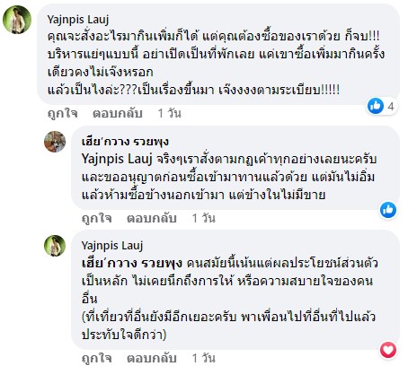 คุณกวาง เล่าต่อว่า จนถึงขณะนี้ยังไม่เข้าใจเลยว่าทำไมทางรีสอร์ท ต้องชี้หน้าต่อว่ารุนแรงขนาดนั้น เพราะถามชดใช้ให้ก็ไม่เอา ทั้งนี้ที่โพสต์เพราะอยากให้เป็นอุทาหรณ์ทั้งฝั่งผู้ประกอบการรีสอร์ท ที่มีกฎระเบียบเช่นนี้ ควรมีบริการไว้รองรับลูกค้า เนื่องจากแหล่งท่องเที่ยวอยู่ไกล และหาของกินยาก หรือก็อะลุ่มอล่วยให้ซื้อจากข้างนอกได้ เพราะอย่างไรก็เป็นสินค้าจากในหมู่บ้าน จากชุมชนแหล่งท่องเที่ยวเดียวกัน และในฝั่งของนักท่องเที่ยวที่จะเดินทางมาควรศึกษาสถานที่ท่องเที่ยว สอบถามเรื่องสถานที่พัก อาหารที่สั่งให้ดีว่ามากน้อยขนาดไหน เพื่อให้เพียงพอในการกิน เพราะที่สะปันเป็นแหล่งท่องเที่ยวธรรมชาติ พอค่ำมาแล้วก็จะหาซื้ออะไรค่อนข้างยาก อย่างไรก็ตามที่พัก รีสอร์ทบนสะปัน ไม่ได้เป็นแบบนี้ทั้งหมด เพราะเคยไปเที่ยวมาก่อนหน้านี้ ก็ทั้งที่พักดี บริการก็ดี อาหารก็มีไว้บริการเพียงพอ