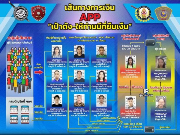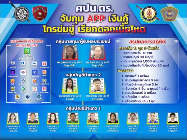 ศปน.ตร.ปฏิบัติการทลายแก๊งปล่อยเงินกู้นอกระบบดอกเบี้ยโหดผ่านแอปพลิเคชัน ส่งข้อความข่มขู่ลูกหนี้ รวบนายทุนจีนพร้อมพวก 19 ราย พบเงินสะพัดในระบบกว่า 2,500 ล้านบาท